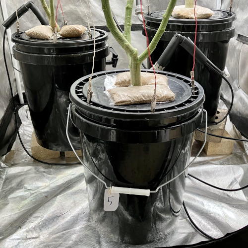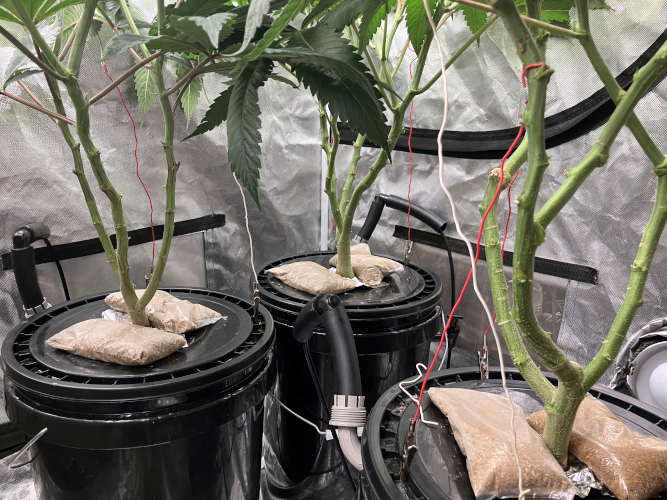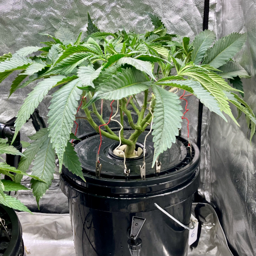 Moved 2 GG and a GT3 to buckets. GG A is first seed, GG B is from a new seed. Both GG have 9 stems and the GT3 currently has 11 stems started. I only have one side stem on the tallest main stem, need to add another. Also need to get stems later to clone new GG (B).