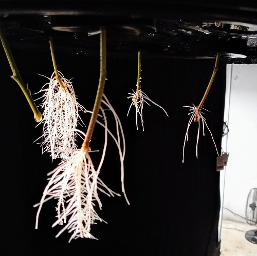 It takes from 5 to 21 days for roots to form on the new clones depending on the strain. Golden Tiger v.3 is fast with 5 to 8 days while Lemon Kush can take up to 21 days. As the roots grow I will trim them daily to promote thicker stems. I mist the plant stems in tap water daily to kill an airborne virus or bacteria that will rot the stems. This problem began when I moved the plants into the basement. I need to check daily for any sign of the rot, brown/gray brown and soft tissue.