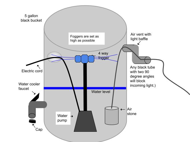 I built my own system for propagating clones. A small pump with a fogger nozzle keeps the clones sprayed with a fine mist of nutrient solution recycling 24 hours a day. A small air pump supplies fresh air through a porous stone to aerate the solution. I used NPT 1″ Cord Grip Cable Glands, Waterproof Adjustable 18-25mm Plastic Cable Connectors Nylon Joints with Lock Nut and Gaskets and 3/4″ black water pipe to make a vent and access for the air hose.