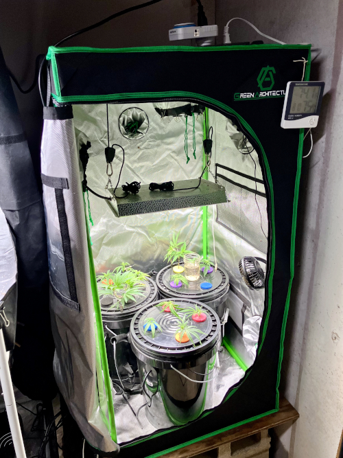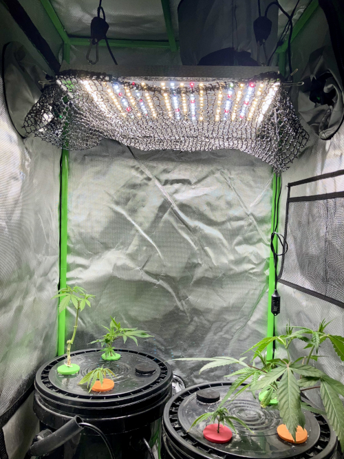 I have a Mars 600 watt (rated) LED light above three buckets with the clones and seedlings I grow. A piece of 30% shade cloth helps the clones grow longer, flexible stems. I bought this tent to give the clones more room and can add a third bucket if needed. Each bucket usually only has four clones or seedlings but I also have a couple of 6x.