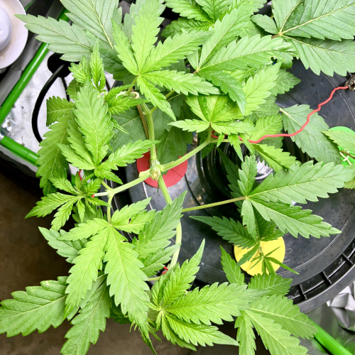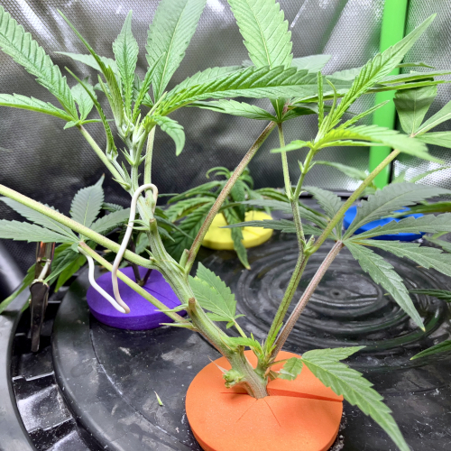 I now top my clones when they have four stems showing at the first nodes. If I only have 2 buckets in a tent I will start six stems to create a wider plant. Four stems are easy to manage and this allows plenty of room for light and air to get to the lower colas.