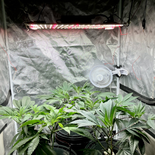 Removed the last of the thinner stems from BK. Some fan leaves needed to be removed from the top. Feeding at 20×70.