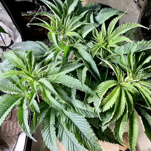Some of the new fan leaves where coming in bright yellow but then rapidly turned dark green. Possibly due to not enough roots for plant size. Seems to be better now with the extra bloom.