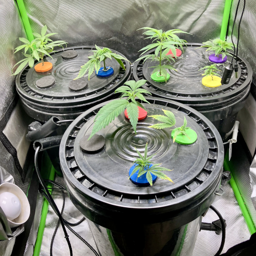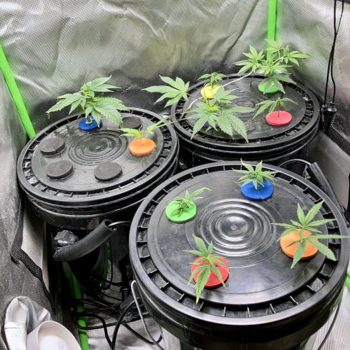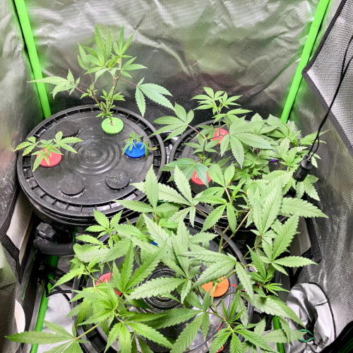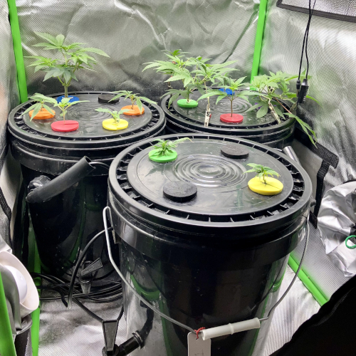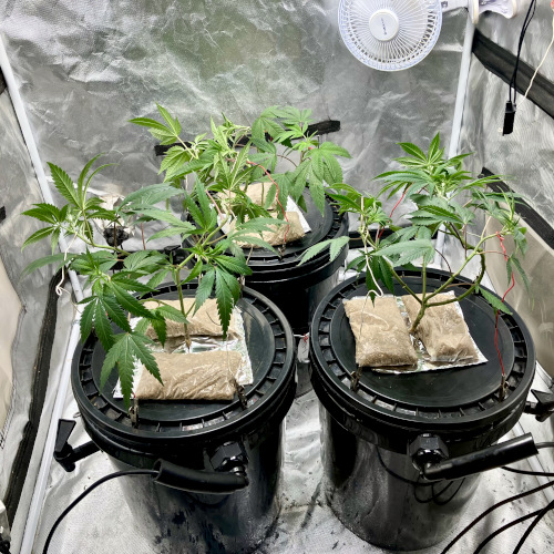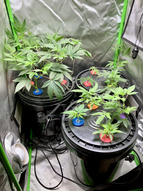 Three buckets in the tent now. Getting ready to start seeds for GT3 and Gelonade. One of the CC clones had stem rot, the other two look fine. BK and Mimosa have roots. I may end up using the GFOG in the next round.