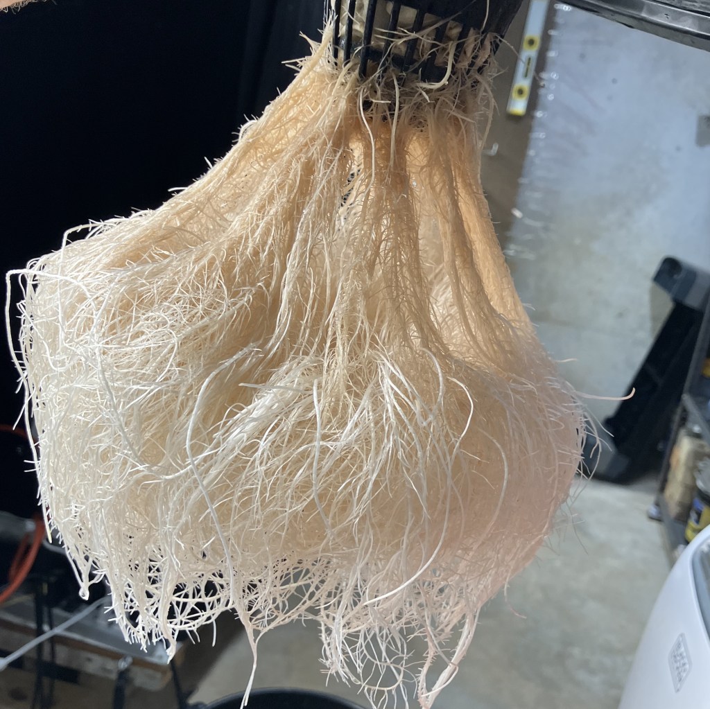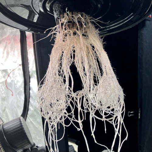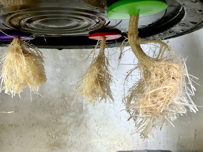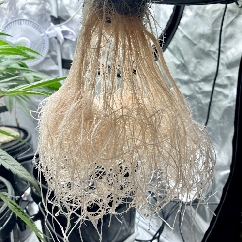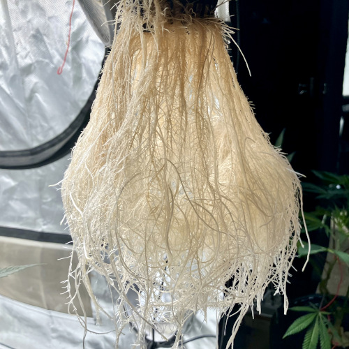 Good roots after first week in buckets. Keeping the roots thinned out before moving to net pot. Better distribution around the pot. Not as jammed up in the pot.