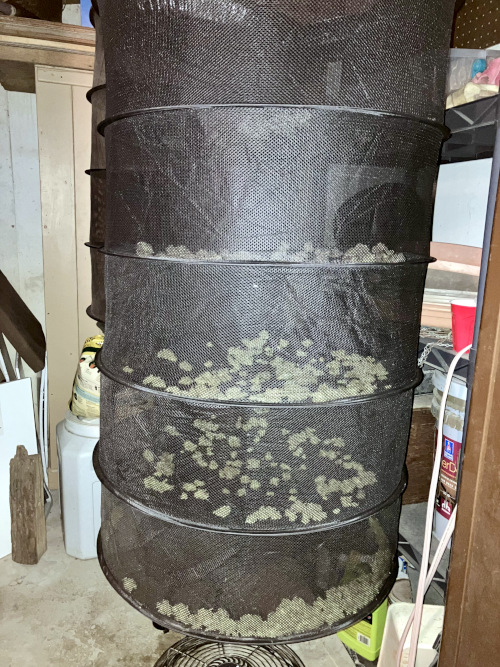 Started harvesting AOG. There were some male flowers at the ends of some of the stacks. A couple of the BK flowers had a couple of seeds (dry, dormant), most did not. Will need to check on this.