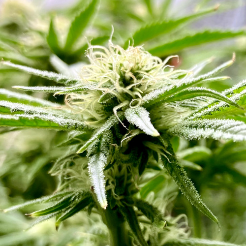 The buds of a mature Mimosa plant are large and cone-shaped, covered with milky-white trichomes and hints of purple from its parent strain — Purple Punch.