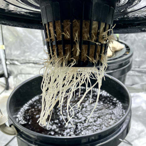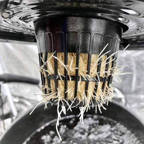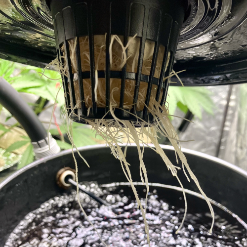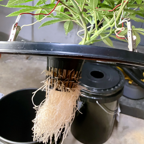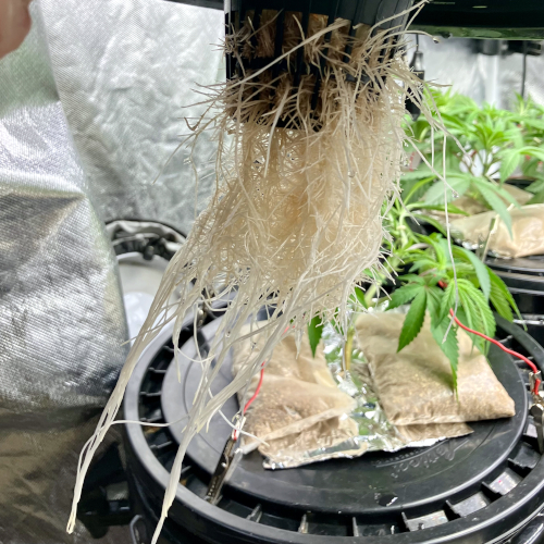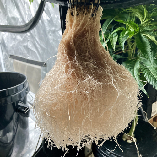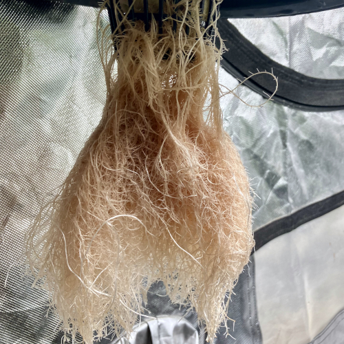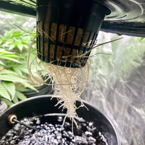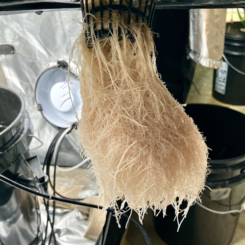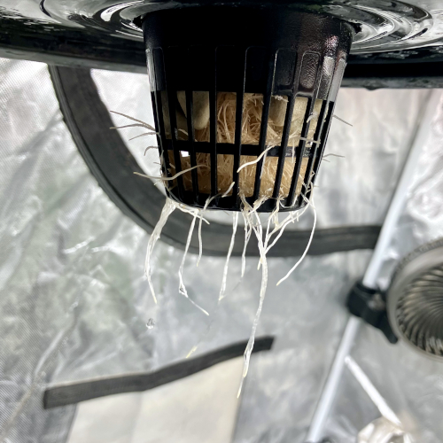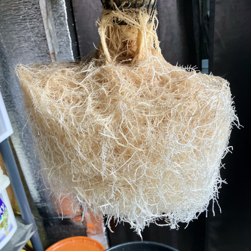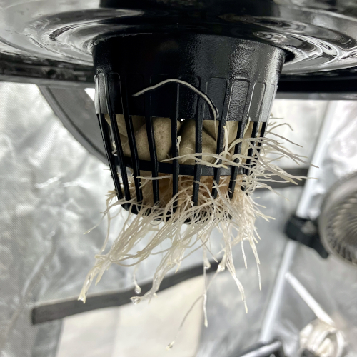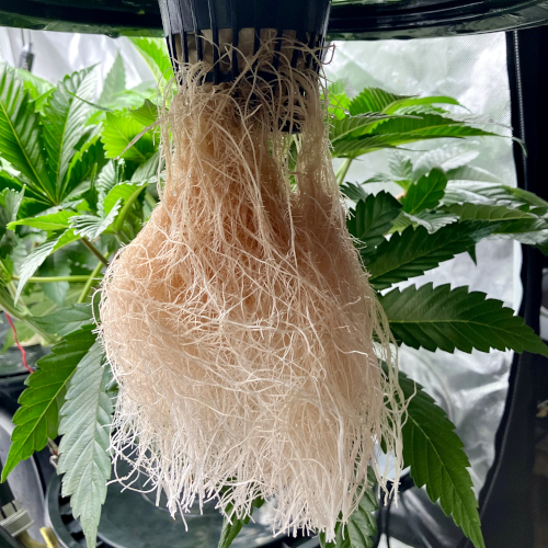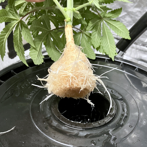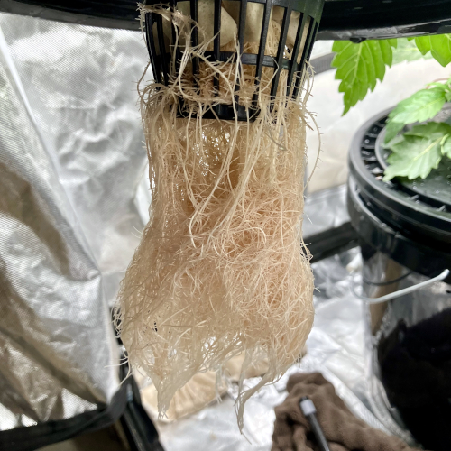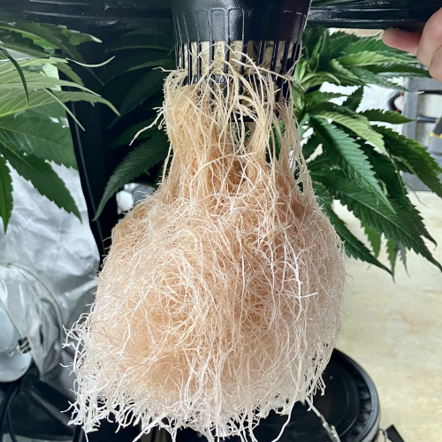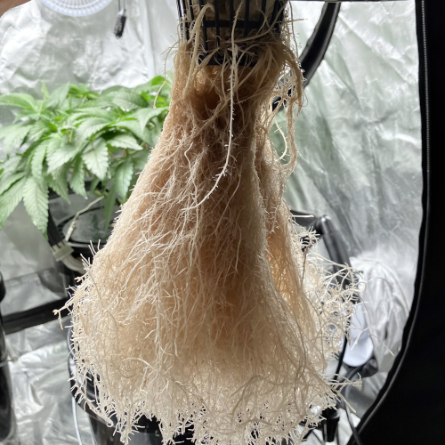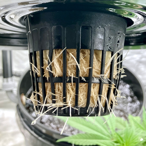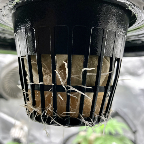 I had to trim the bottom of the Blackberry Kush roots to fit into the net pot. The younger Godfather OG fit perfectly.