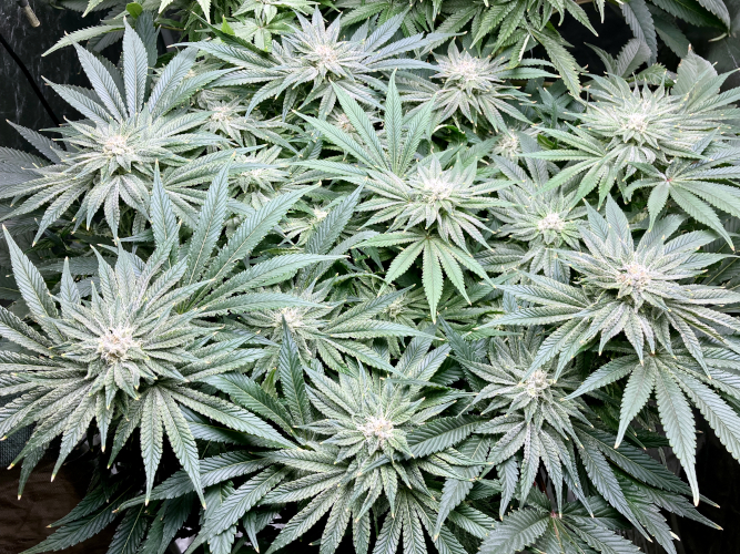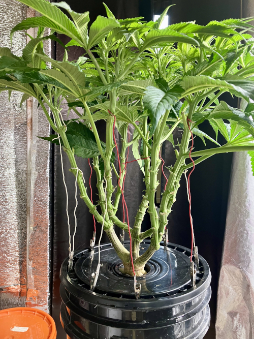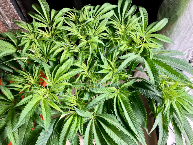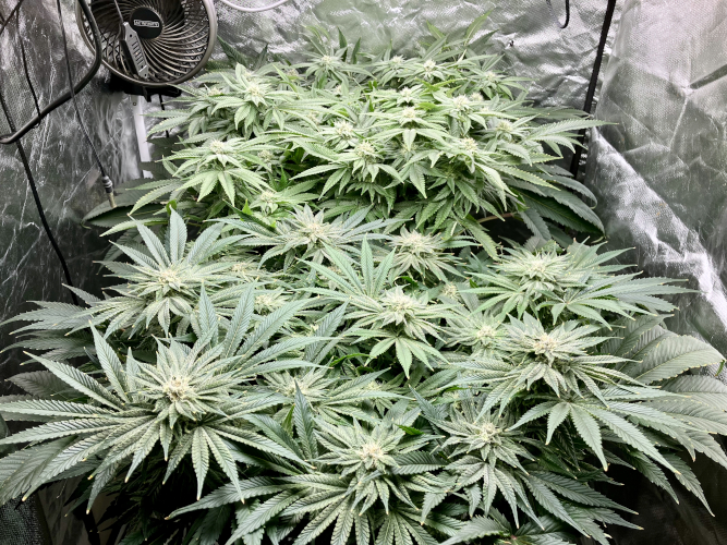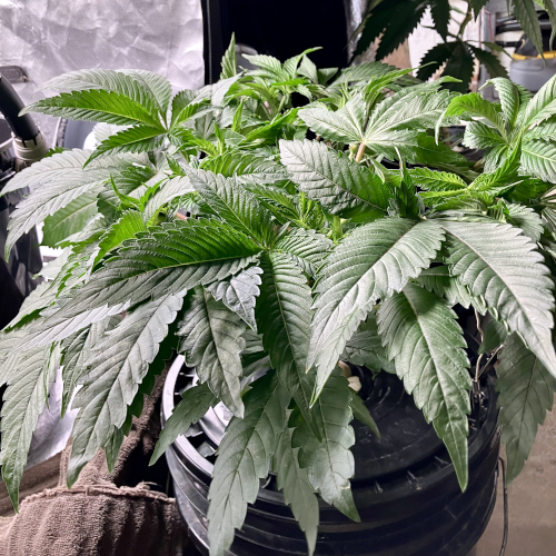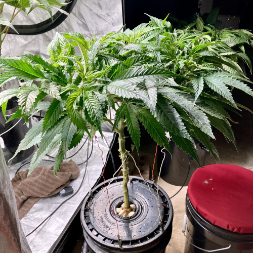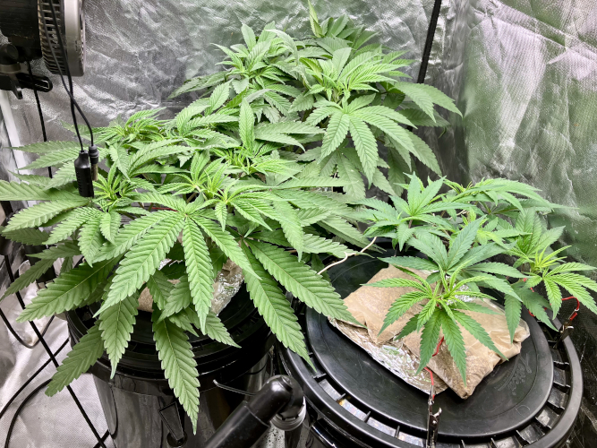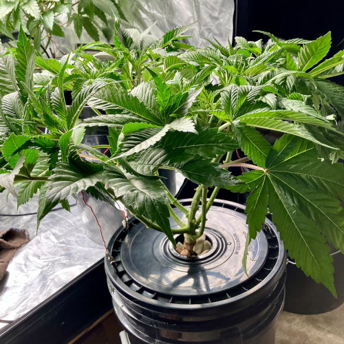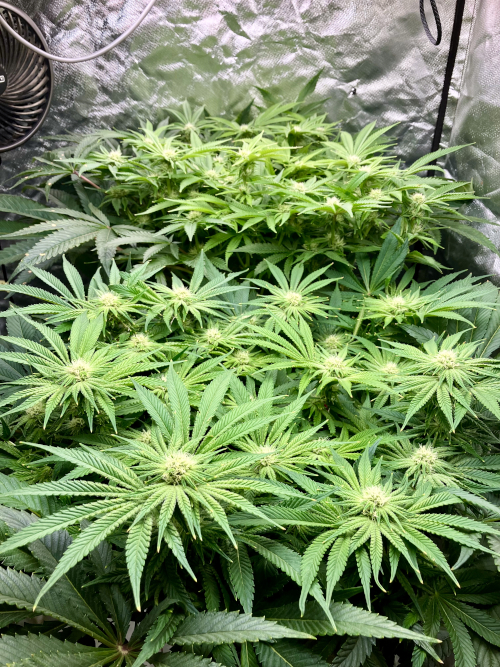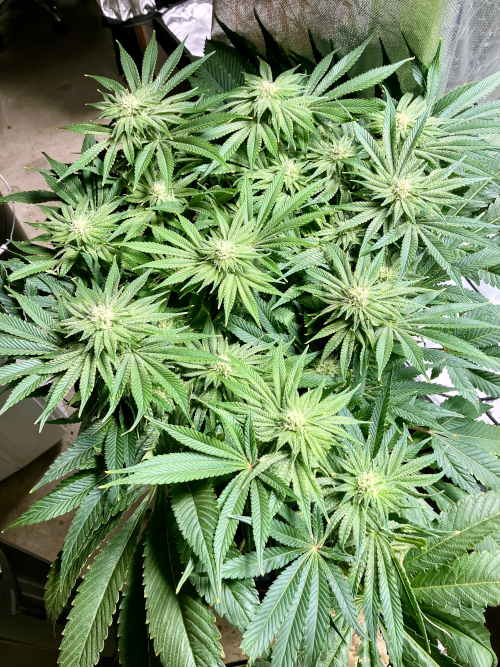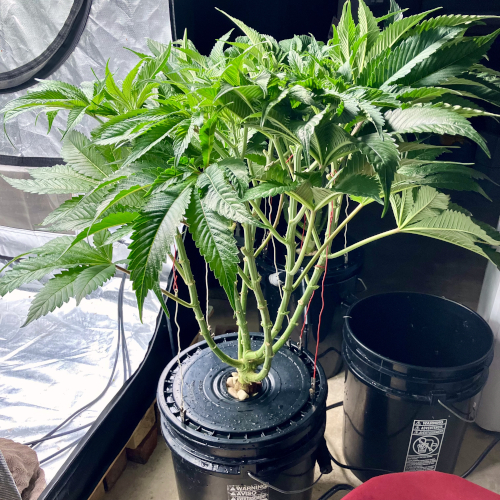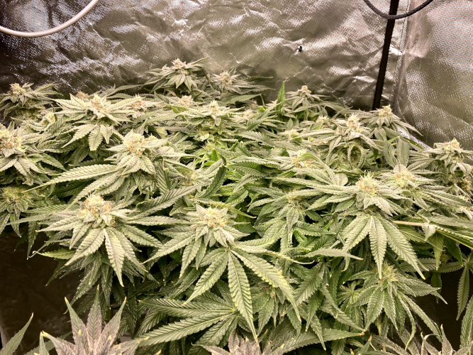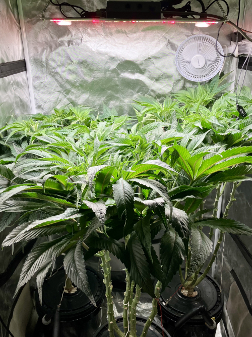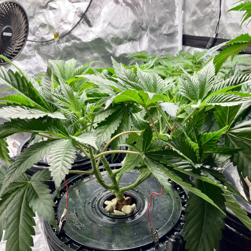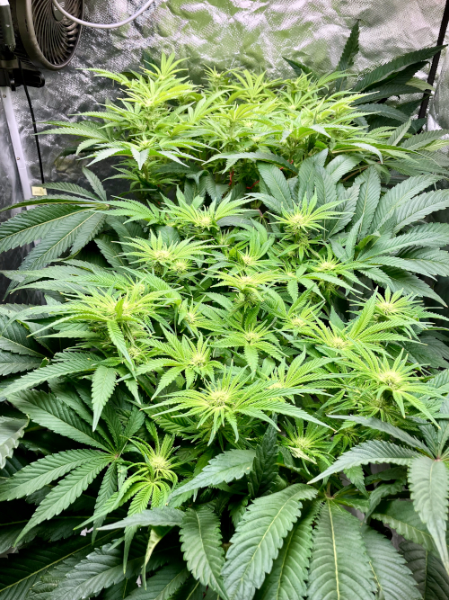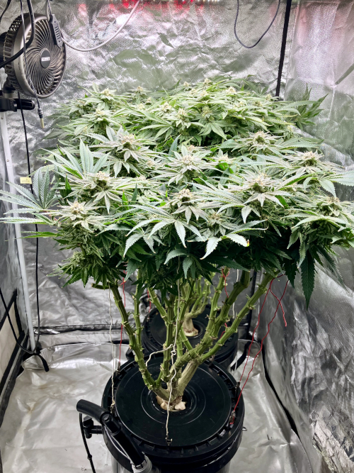 Both plants using a little under 2 liters per day. Removing any fan leaves that are starting to show necrosis. GG has top flowers that have few or no new flowers forming. I will cut some of these at 6 weeks unless I see new flowers starting to form.