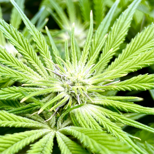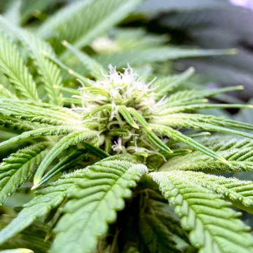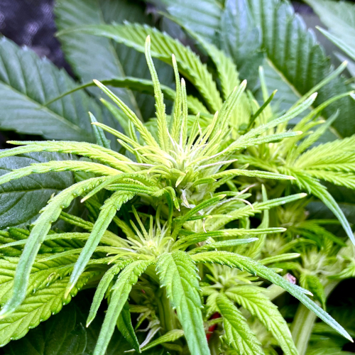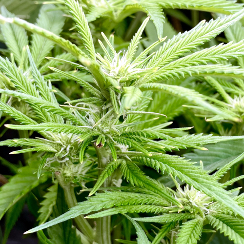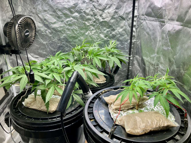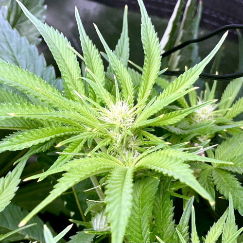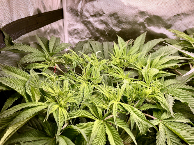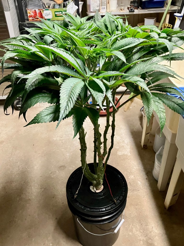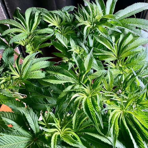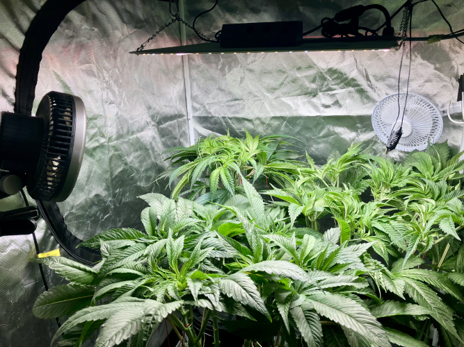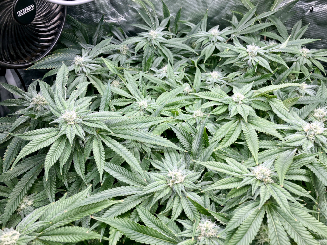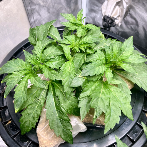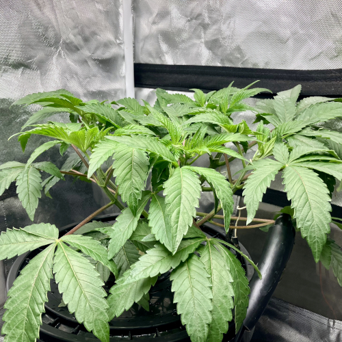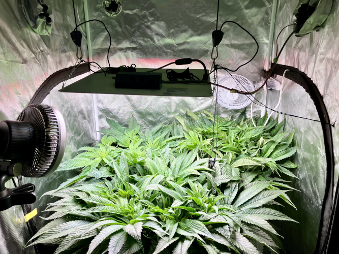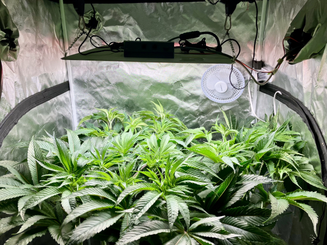 Both plants using a little under 2 liters per day. Removing any fan leaves that are starting to show necrosis. GG has top flowers that have few or no new flowers forming. I will cut some of these at 6 weeks unless I see new flowers starting to form.