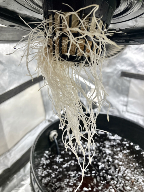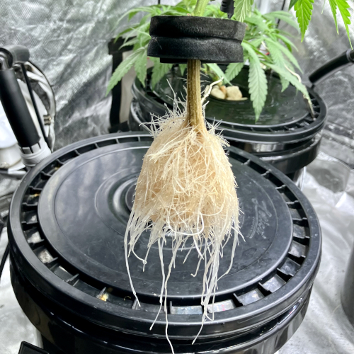Lots of new root growth on the Biscotti. Very healthy plant, trimmed some of the top fan leaves along with a couple of the lowest.