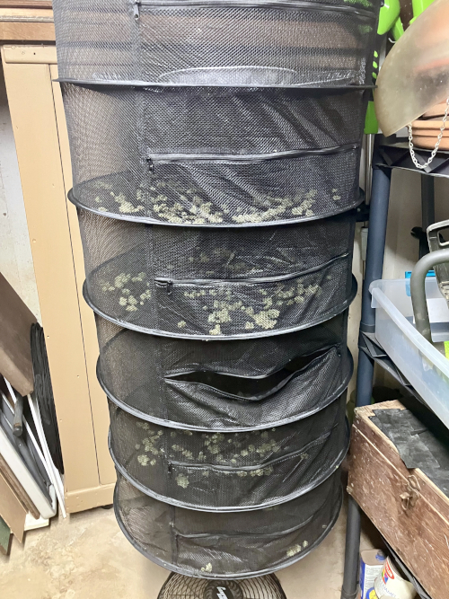 Harvested the first flowers from GGB a couple of days short of 6 weeks since the lights were cut back to 12 hours. No new flowers forming on top. Need to start harvesting tops without new flowers forming.