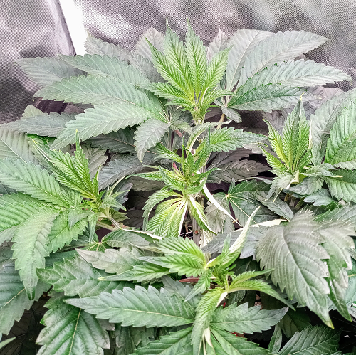 This is a very slow growing strain. It takes longer for the roots to form when cloning. The large, soft fan leaves will cover the tips of the stems as they grow. The leaves need to be pushed down and sometimes held down with wires. The intense light I use does cause the fan leaves on most strains to grow upward to some extent but the SJ leaves seem to hug the tip and block the light. I have started to remove one of the two fan leaves that form as a stem grows. This lets more light hit the growing tip so it will grow faster. On most of my plants I now try to keep two rows of fan leaves and remove the oldest leaves as new ones form. This allows good airflow around the base of the plant and removes the less efficient older leaves which are mostly shaded anyway.